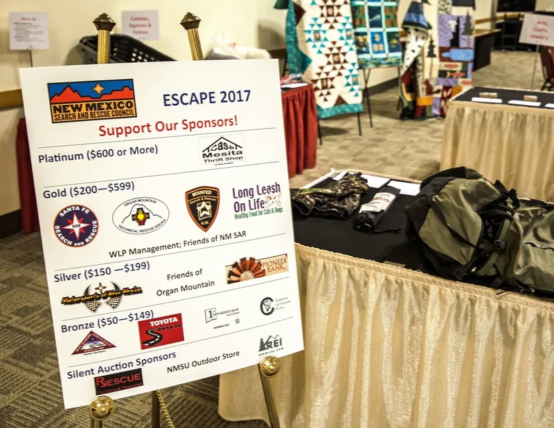 Atrisco Cafe & Bar, Batteries + Bulbs-Santa Fe, Big 5 Sporting Goods, Capitol Ford Lincoln - Santa Fe, Cid's Market, Cheryl Price, David Price, Eldorado Country Pet & Wild Bird, Five Star Burgers, Friends of NMSAR, Harry's Roadhouse, Horse n Hound Feed N Supply, Jinja Bar & Bistro, John Brooks Eldorado Supermarket, Las Colcheras Quilting Guild, Lorie Stauffer, Massage Therapy Training Institute, Melissa Pfeiffer, Mountain Canine Corps, National Association for Search & Rescue, New Mexico Search & Rescue Council, New Mexico State University Outdoor Recreation Store, New Mexico Working K9s, NM SAR Support Team, Organ Mountain Technical Rescue Squad, Pajarito Canine SAR, Pecos Trail Cafe, Petsmart, REI New Mexico, Rescue Tactics and Training, Salon PuraVida-Santa Fe, Sandia Search Dogs, Santa Fe Bar and Grill, SAR Shop, SeanMcGann, Second Street Brewery, Si Senor Restaurant - Las Cruces, Spenser Moreland, Steve Crawford, Uli Blann