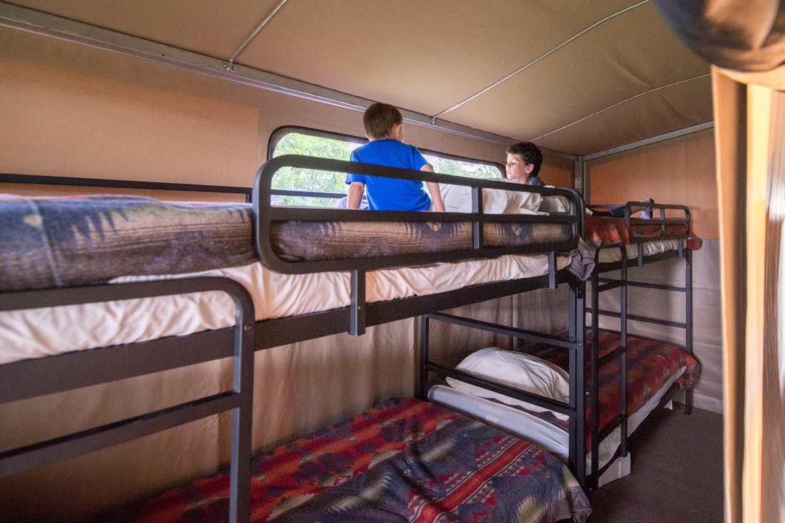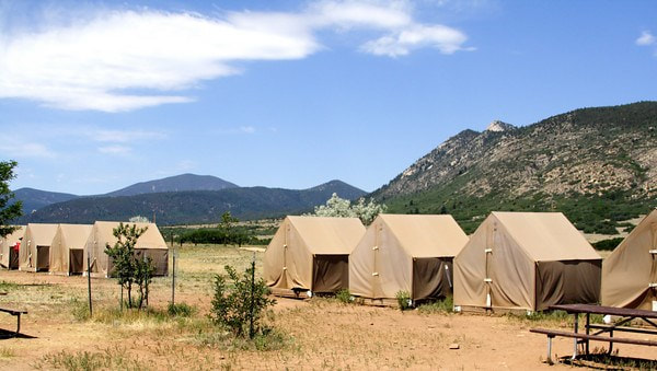 These tents offer room for 5 – 6 with electricity and a ceiling fan. In the main room is a queen-sized bed and in the side room are 2 sets of bunk beds. The Luxury Deluxe Tents are a short walk away to our shower house, where individual locking units contain a shower, sink, toilet, mirror, and power outlets. Philmont will provide upgraded bedding and towels during your stay in the Luxury Deluxe Tents.